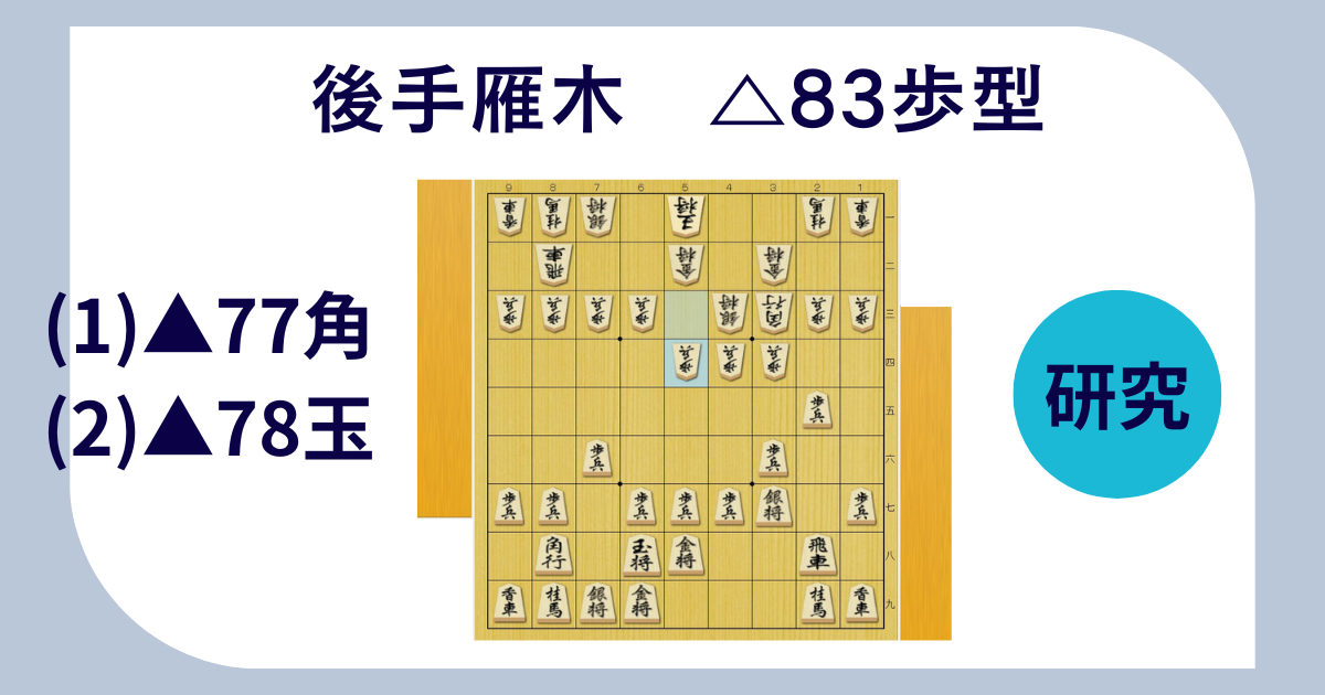 こちらの記事で検討したように、△84歩と突いてある格好では早めに▲77角と上がるが、△83歩型では▲77角と上がると△74歩ー△72飛の変化を与える。