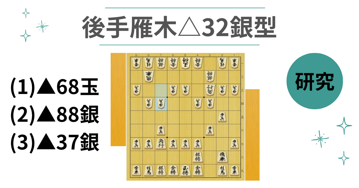 雁木と言っても、先手の駒組みによって△43銀か△43金かを選ぶ△32銀型の将棋だ。